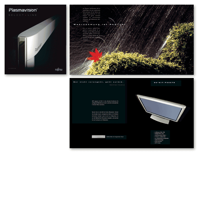 Jedes realisierte Konzept führt über mehrere Alternativen, die für sich gesehen ebenso zu einer Lösung hätten werden können. Dieser Vorschlag zielte darauf ab, die Bildqualität eines Plasmapanels so zu illustrieren, dass der Betrachter das Gefühl bekommt er könne als Zuschauer "nass" werden.