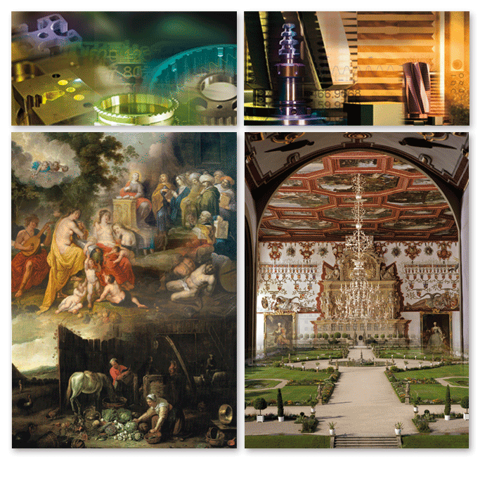 Composings sind erzählende Bilder. Wir kennen sie von vielen Kinoplakaten, und sie sind ein probates Mittel zur Vermittlung von Nutzwertinformationen und Inhalten. Die obere Reihe bezieht sich auf die Anwendungsbereiche aus der Messtechnik. Die untere Reihe auf die Inhaltsvermittlung von Büchern. Das Bild links unten ist aus vier verschiedenen Gemälden zusammengesetzt, das rechte aus zwei. Das Schöne daran ist oftmals die verblüffende Wirkung und der daraus resultierende Überraschungseffekt.