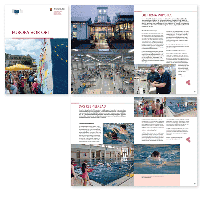 Im Zusammenspiel mit der Europäischen Kommission und der Landesvertretung von Rheinland-Pfalz in Berlin entstand die Broschüre ’Europa vor Ort', in der exemplarisch Förderprojekte in Rheinland-Pfalz vorgestellt werden.