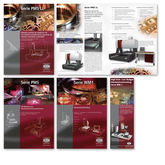 Die Penetrierung der Farbe Rot als Erkennungsmerkmal der Dr. Schneider Messtechnik durch Prospekte und Anzeigen. Die Bildkollagen geben einen Eindruck über die Einsatzgebiete der Messmaschinen ab, ohne konkret zu werden. Auf diese Weise werden Ausschließungen vermieden und Applikationsassoziationen geweckt. |